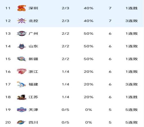 从以上积分榜来看,北京队、广东队继续保持全胜,辽宁队、广厦队都是4胜1负,分列第三、第四,另外全败的球队仅剩天津队、四川队,江苏队已经拿到了首场胜利。作为昔日的总冠军,四川队本轮比赛遭遇51分的惨败,继续沦为垫底位置。