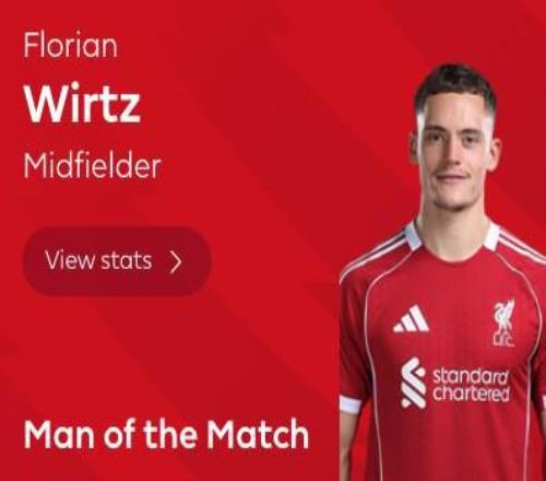 英超第20轮,利物浦客场2-2战平富勒姆,此役打入一球的利物浦中场维尔茨当选全场最佳球员。