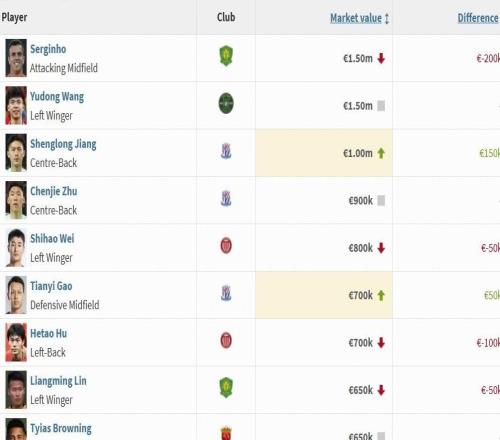 中超国内球员身价前十:塞鸟、王钰栋150万欧居首,韦世豪第五